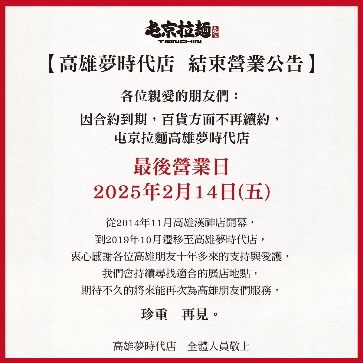 屯京拉麵於2月6日在其臉書專頁上發布公告,表示由於租約到期,百貨公司方面決定不再續約,因此高雄夢時代店將在2月14日結束營業。該店自2014年11月在高雄漢神百貨開幕,並於2019年10月遷至夢時代,至今已經營超過十年。業者在公告中感謝高雄顧客多年的支持與愛護,並承諾將繼續尋找適合的地點重新開店,希望不久的將來能再次為高雄的朋友們服務。