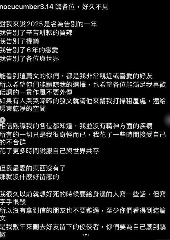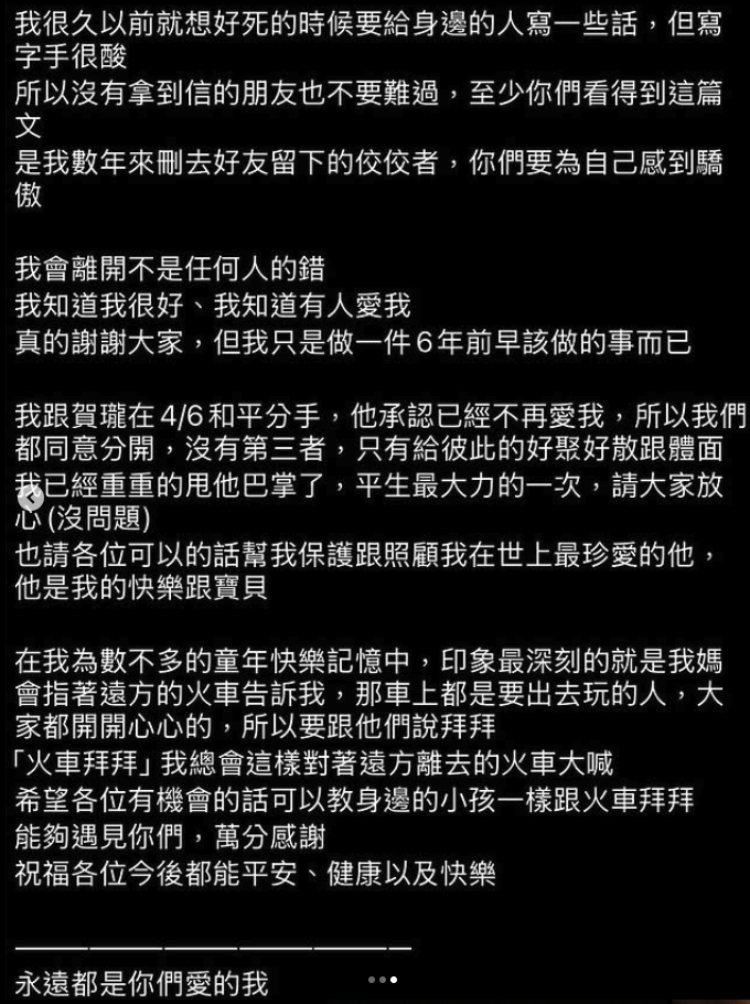 賀瓏並在文末附上兩張截圖,為日前離世的喜劇演員「天殘」(翁芝瑩)留下的最後訊息。他強調,這將是他第一次也是最後一次談論前女友的相關話題,並呼籲外界給予家屬更多空間,不再造成二度傷害。