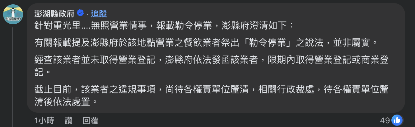 ▲澎湖縣政府強調並無勒令停業。(圖/翻攝自臉書)