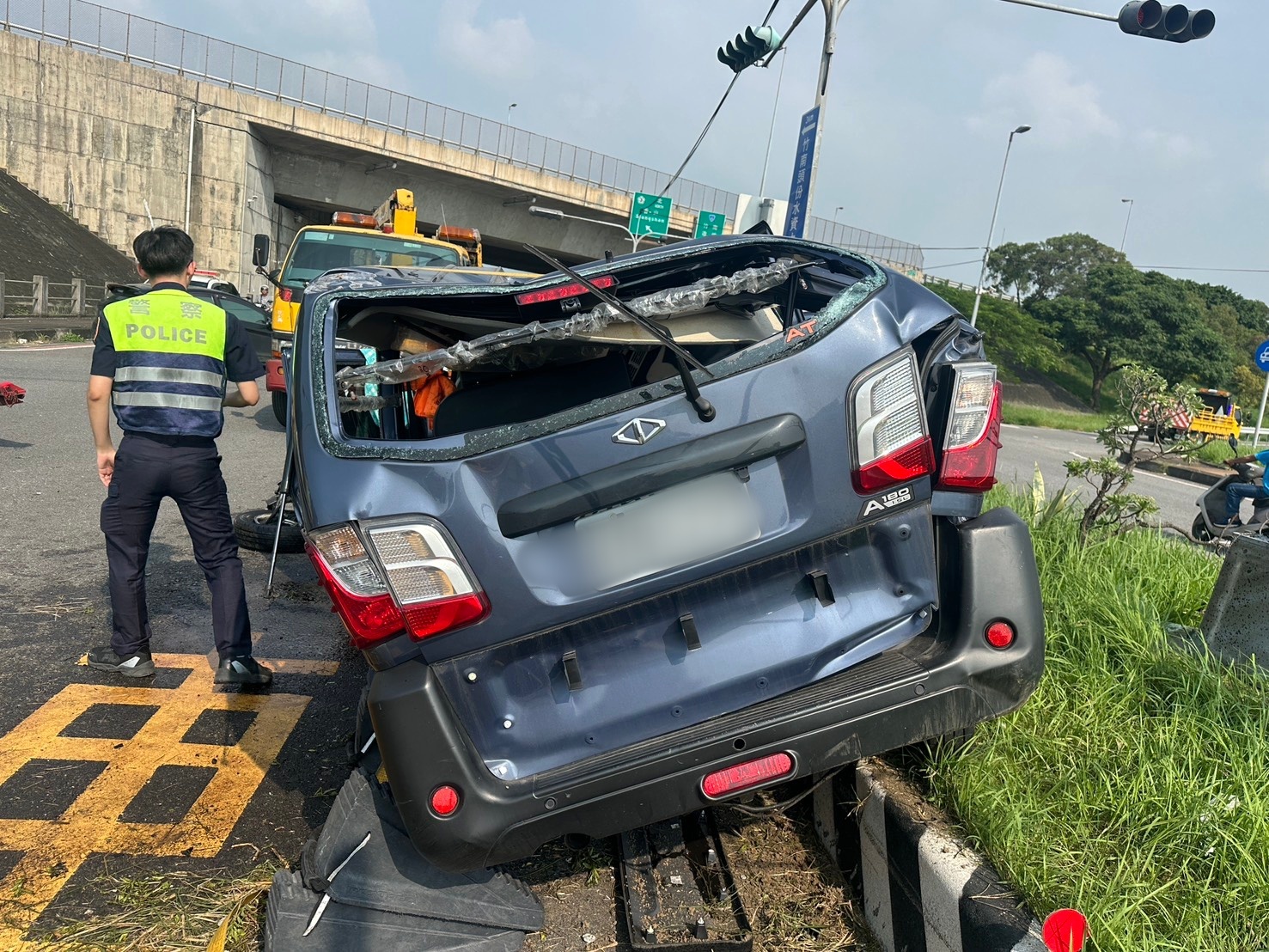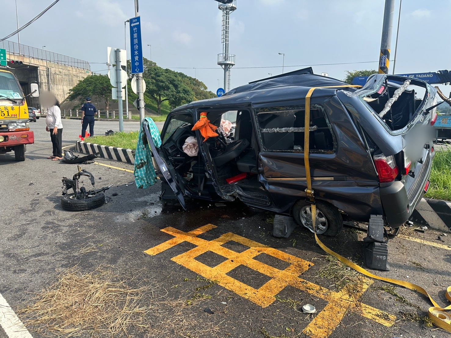 苗栗竹南國道三號交流道驚傳翻車事故!今(1)日下午3點4分,一輛自小客車在竹南鎮國道三號南下入口台一己路段自撞電線桿後翻覆,51歲男性駕駛受困車內,苗栗縣消防局獲報後出動3車7人前往救援。救援人員使用破壞器材及長背板協助脫困,並進行包紮止血處置後,將傷者送往為恭醫院救治,駕駛意識清楚但肢體無力。 ▼撞擊力道大道車頭完全變形。(圖/記者翻攝)