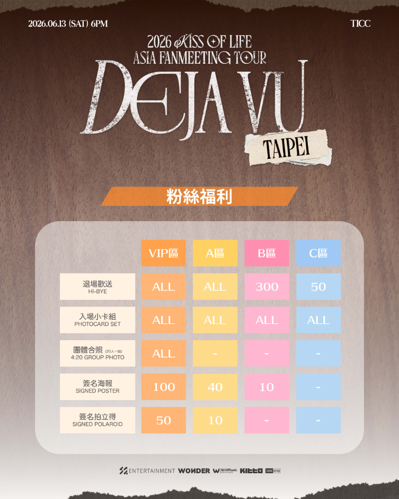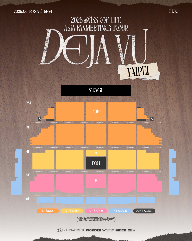 韓流實力女團KISS OF LIFE,訂於6/13(六)PM6:00於台北「TICC國際會議中心」舉辦「2026 KISS OF LIFE ASIA FANMEETING TOUR <DEJA VU> IN TAIPEI」,全區採座位制,票價共分VIP 區NT.5500元、A區NT.4800元、B區NT.3800元與身心區NT.2750元,福利上,共有Hi-BYE、典藏小卡組、團體合照、親簽海報、親簽拍立得,售票分兩種方式,計為會員優先2/28(六)AM11:00至PM22:00,一般售票則是3/1(日)中午12:00啟售,更多「2026 KISS OF LIFE ASIA FANMEETING TOUR <DEJA VU> IN TAIPEI」。