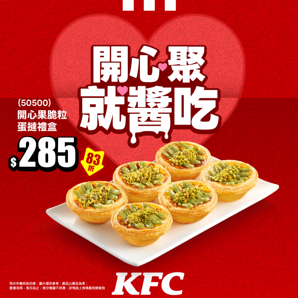 在甜點部分,肯德基推出了「開心果脆粒蛋撻禮盒」,活動期間(4/28-5/11)優惠價$285(原價$342)。這款甜蜜組合獨家加入「夢幻三層美味連動」,超柔滑開心果慕斯層,搭配濃郁奶蛋香,包裹著驚喜的開心果流心內餡,灑上開心果脆粒,每一口都是極致感官的「開心交響樂」。這款蛋撻不僅能提供日常即時的療癒補給,在相聚時刻更能讓全家一起感受層層疊加的幸福感。