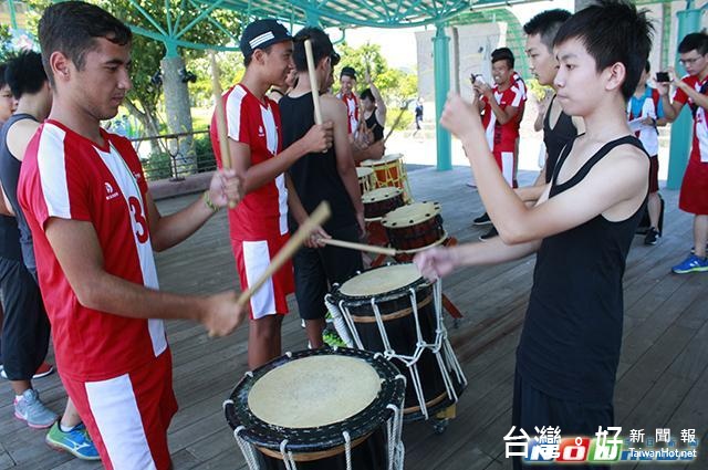 這群吉爾吉斯家扶青少年抵達童玩節園區,與宜蘭家扶太鼓隊孩子,以歌聲和鼓聲開心見面、交流體驗。宜蘭家扶太鼓隊特別秀了一段迎賓鼓曲,並帶著吉爾吉斯的青少年體驗鼓聲的震撼,還送上手作的卡片和吸水杯墊,以及象徵福氣滿滿的紅包袋,希望環島之行能夠順利平安。吉爾吉斯青少年則以歌聲和微笑表達感謝,以及傳達友善情誼。