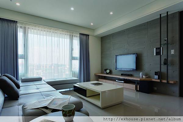 在清水模漆主牆上放入鐵件架構層板與木質櫃的線條,並搭配木牆櫃,灰揉合木質以提升家的暖度。圖片提供_ 法蘭德室內設計