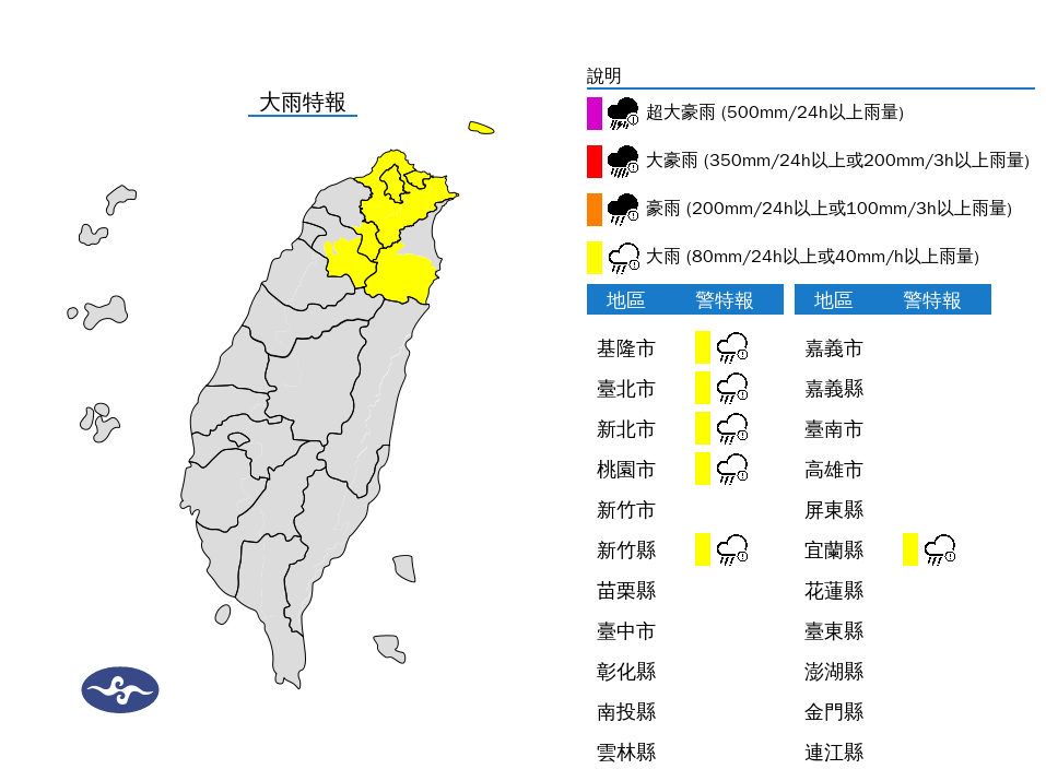 受到風神颱風外圍環流與東北季風共伴影響,全台北部及東半部地區降雨劇烈,中央氣象署昨(20)日啟動與颱風警報同級的「劇烈豪雨事件加強作業」,預估今、明兩日為降雨最明顯時段。根據氣象署今(21)日下午最新預報,台北、新北、桃園及宜蘭山區雨量已達停班停課標準,不過是否放假仍由地方政府裁定。