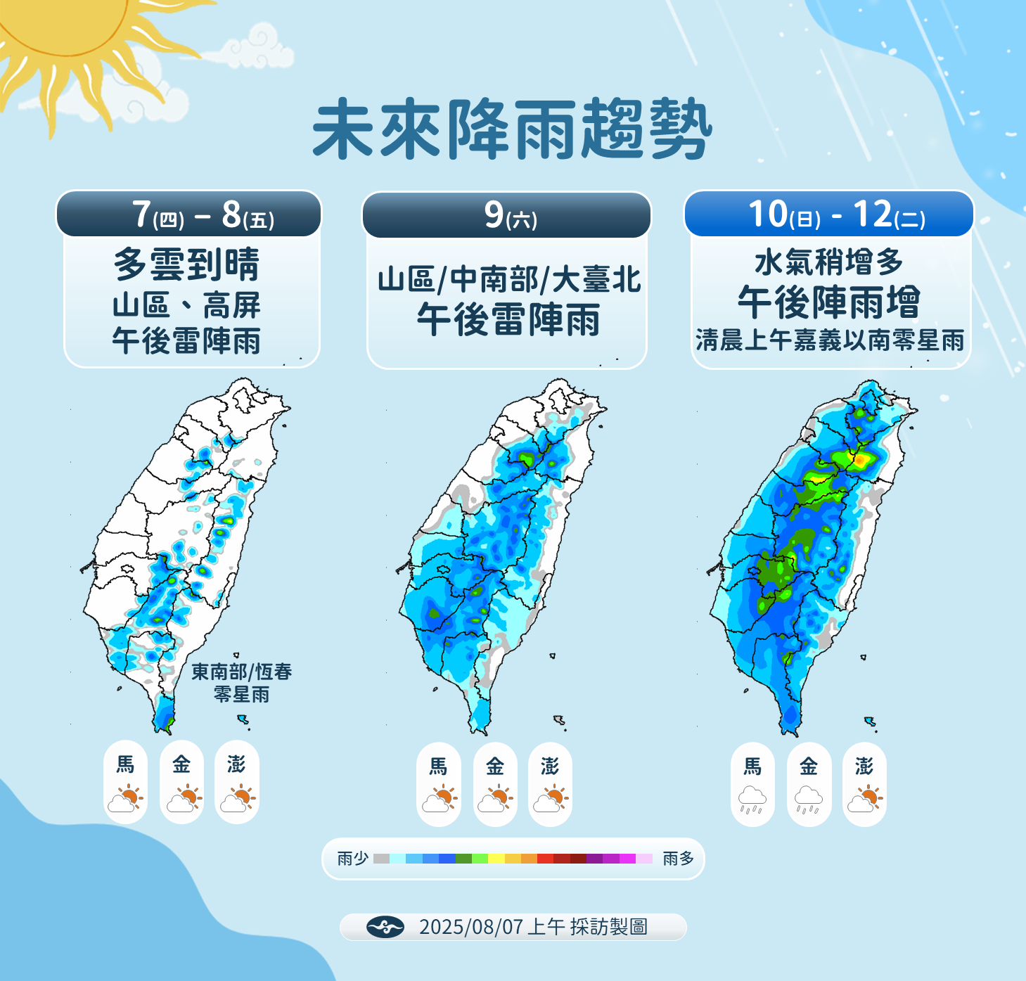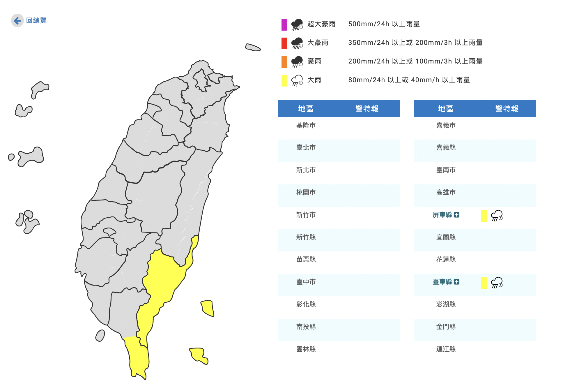中央氣象署提醒,迎風面的花東地區與宜蘭、高屏山區需嚴防豪雨,基隆北海岸、屏東平地及臺南以北山區也可能有大雨,呼籲民眾避免前往山區及溪河活動,並