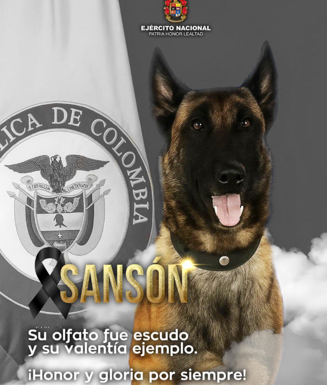 哥倫比亞一隻年僅4歲的偵爆犬「桑松」(Sansn),日前在一次掃雷任務中成功發現爆炸裝置,保住36名士兵與數百名平民的性命,卻不幸因爆炸導致前腿斷裂。牠在重傷之下仍艱難地爬回領犬員身邊,最終傷重不治。哥倫比亞軍方為此舉辦了一場隆重告別式,表彰這位四足英雄的無私奉獻與英勇精神。
