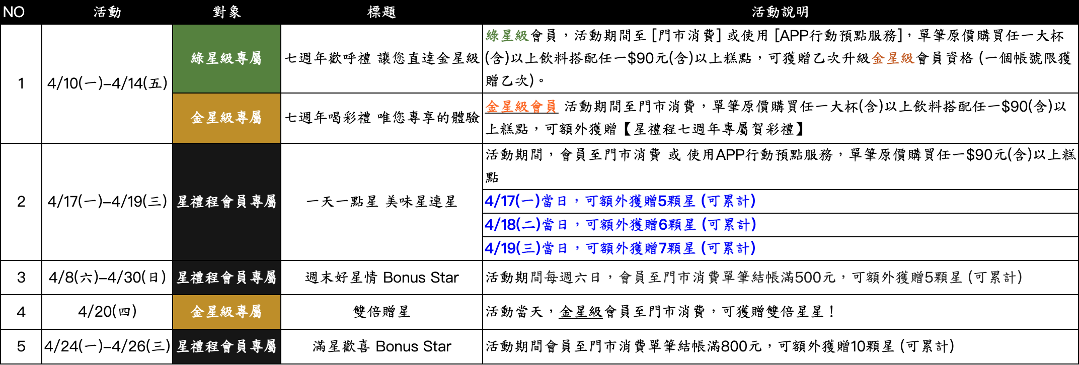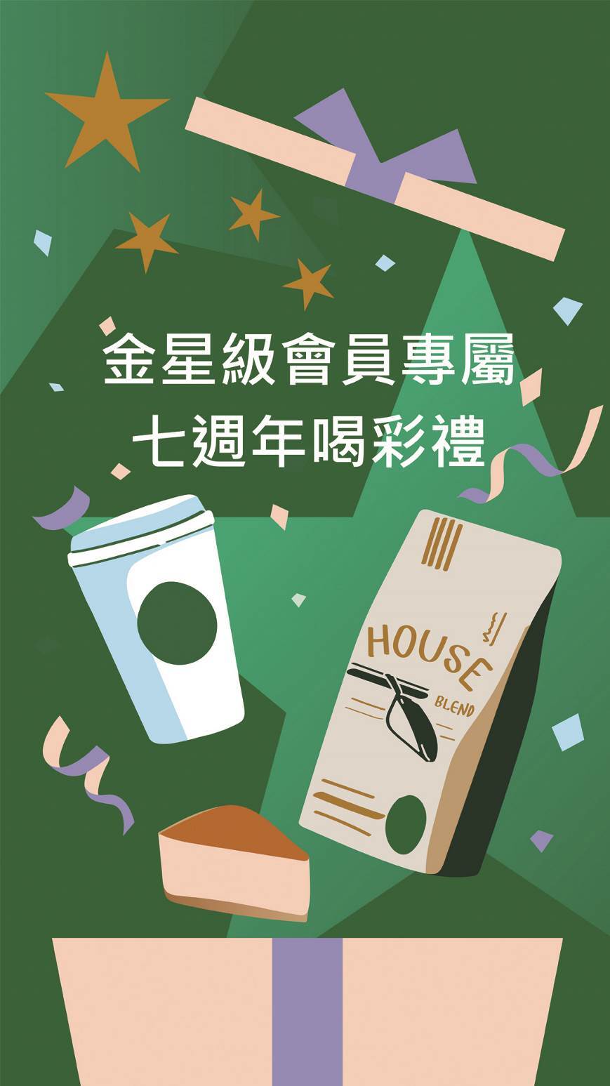 而對於已經是金星級會員的顧客,星禮程也有獨家優惠活動,只要在即日起至4月14日期間,至門市消費,並購買任一大杯(含)以上飲料搭配任一$90(含)以上糕點,就可以額外獲得「星禮程七週年專屬喝彩禮」,包含中杯指定新品飲料體驗券、飲料好友分享券及咖啡豆、商品等七張優惠回饋,可以讓顧客找到最喜歡的搭配組合。
