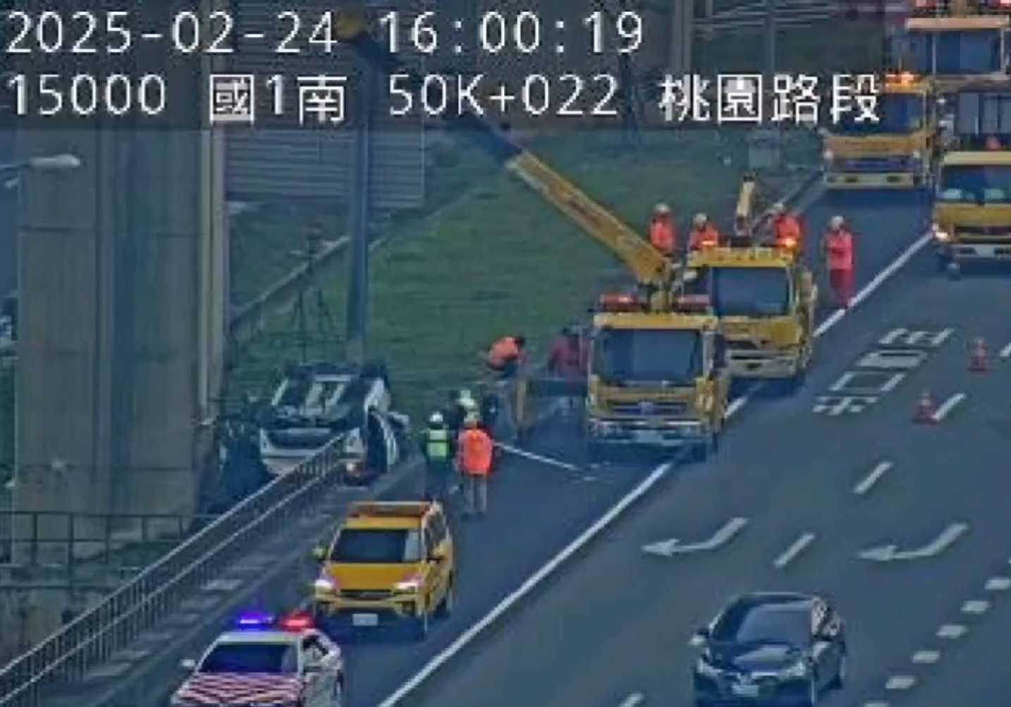 國1驚險車禍!轎車衝撞護欄翻覆「四輪朝天」 40歲男自行爬出車外