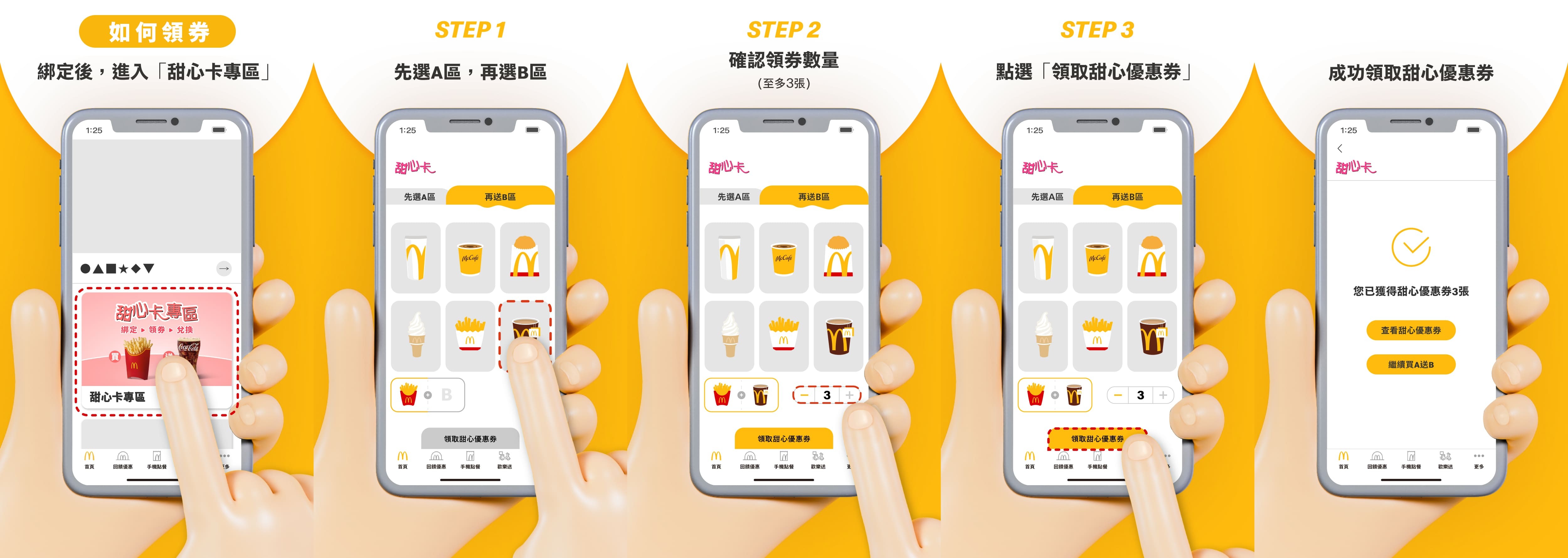 - 領取優惠券:在APP內選擇A區與B區產品,最多可領取3張優惠券。