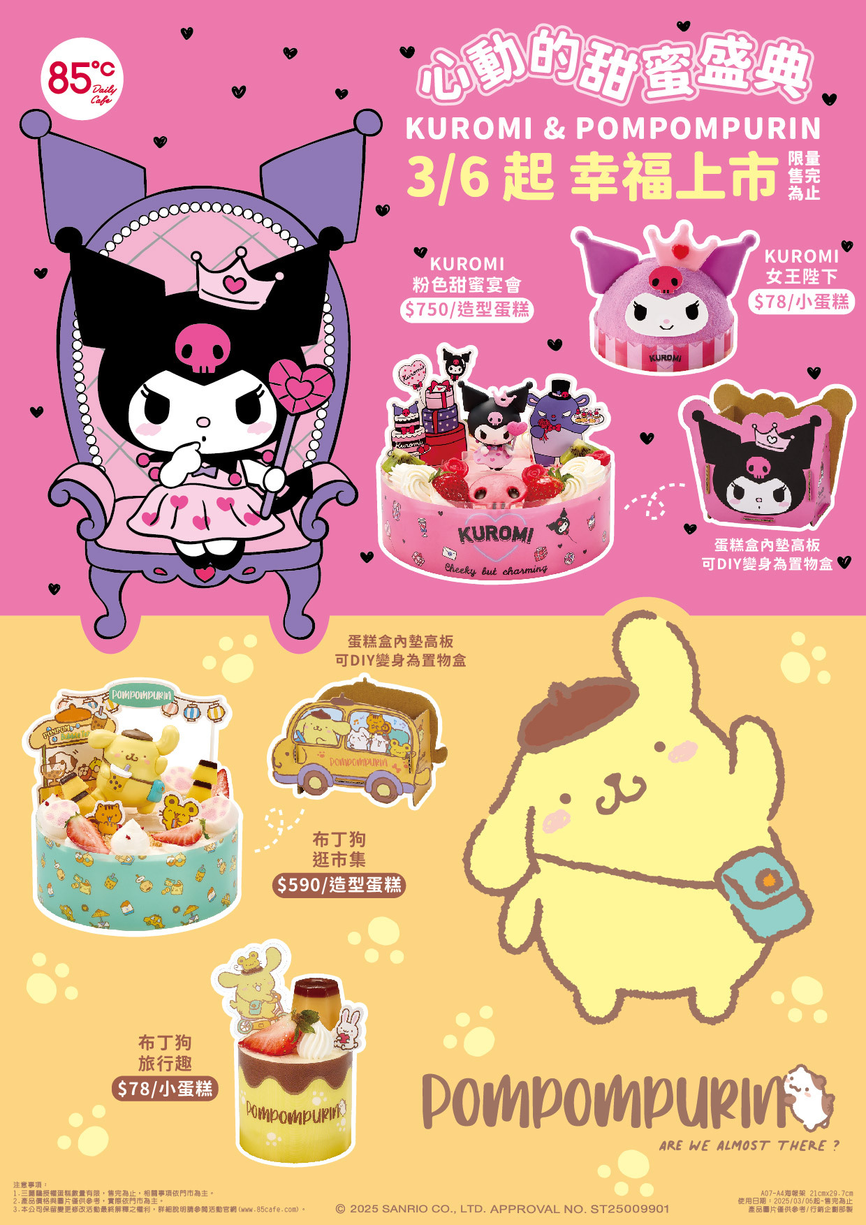 85℃再度與三麗鷗合作,這次由人氣角色KUROMI和布丁狗帶來全新甜品系列,邀請大家參加「心動的甜蜜盛典」!此次推出的四款造型蛋糕不僅外觀可愛,還附有DIY功能的蛋糕盒,讓粉絲們在享受美味的同時,也能擁有實用的收藏品。這些限量蛋糕將於3月6日起在全台85℃門市開賣,共計9萬6千個,預計創造1千7百萬元的銷售額。想要擁有這些夢幻甜品的朋友們,千萬別錯過。