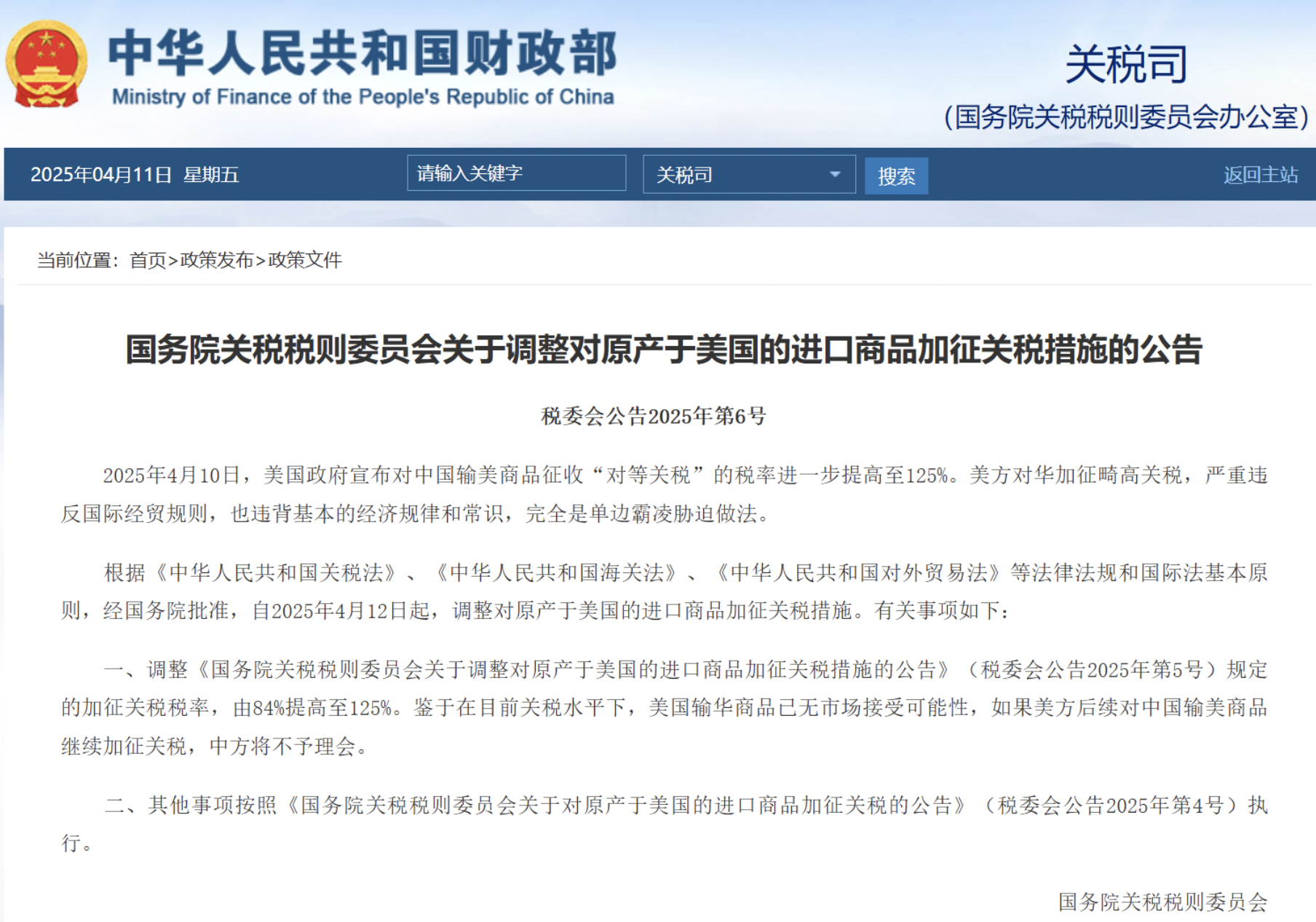 中國對美國貿易反制再升級!面對美國總統川普堅持對中國輸美商品祭出高額「對等關稅」政策,北京也不再手軟。中國國務院關稅稅則委員會今(11)日公告,自4月12日起,將對原產於美國的進口商品加徵關稅,稅率從原先的84%調高至125%。中方並強調,如果美方還要繼續加碼,他們將「不予理會」。