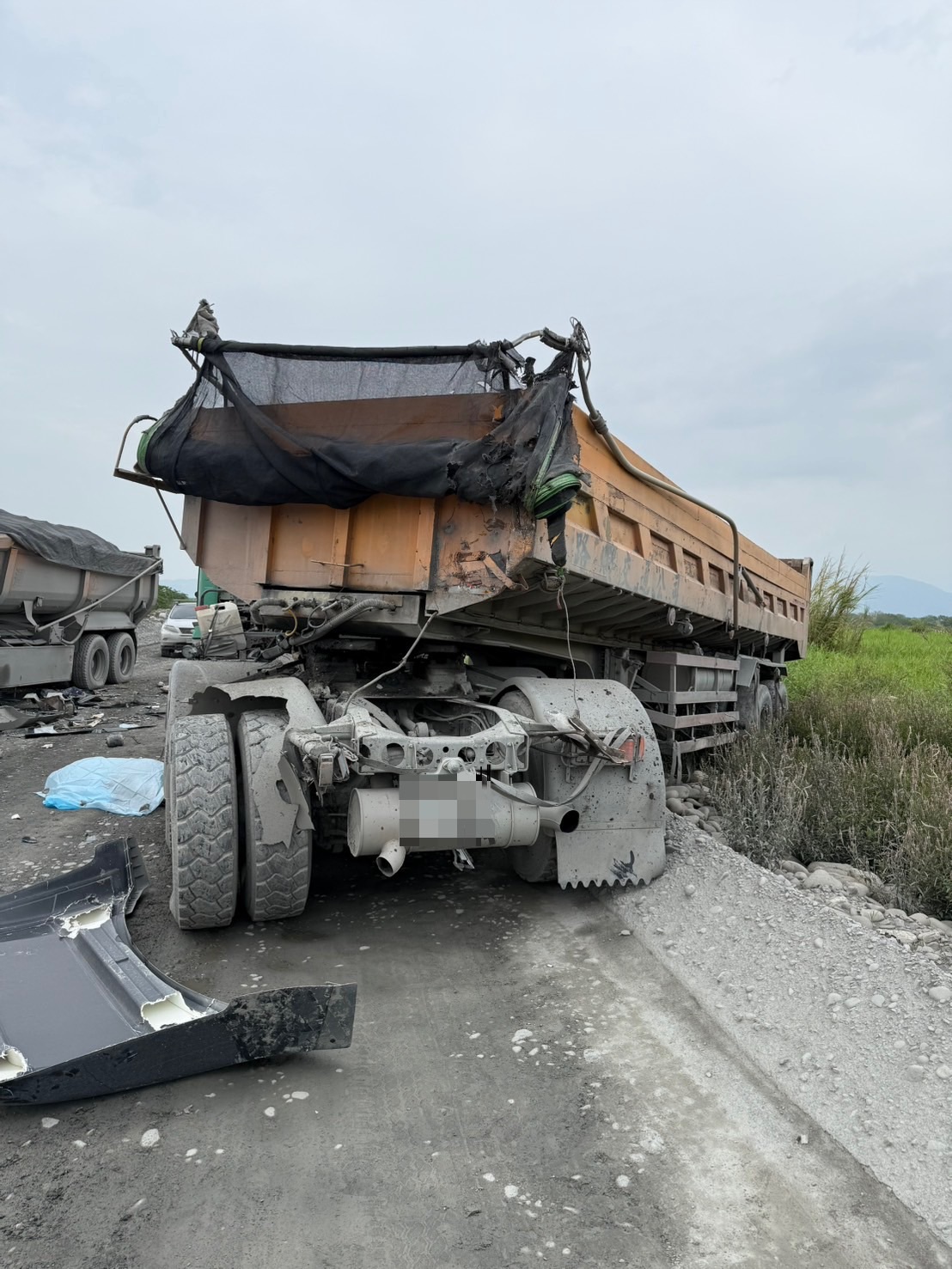 ▲兩輛砂石車對撞,駕駛噴飛車外慘遭輾斃。(圖/警方提供)
