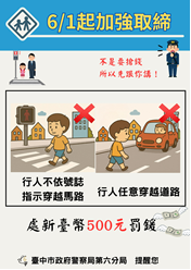 為防堵行人違規釀災,第六分局已於5月初製作宣導圖卡,並透過議員、里長、協勤民力等廣泛宣導。警方也預告,自6月1日起將加強取締執法力道,針對商圈、學校周邊、長者晨運場域等熱區加強巡邏與開罰,期望有效降低違規風險。