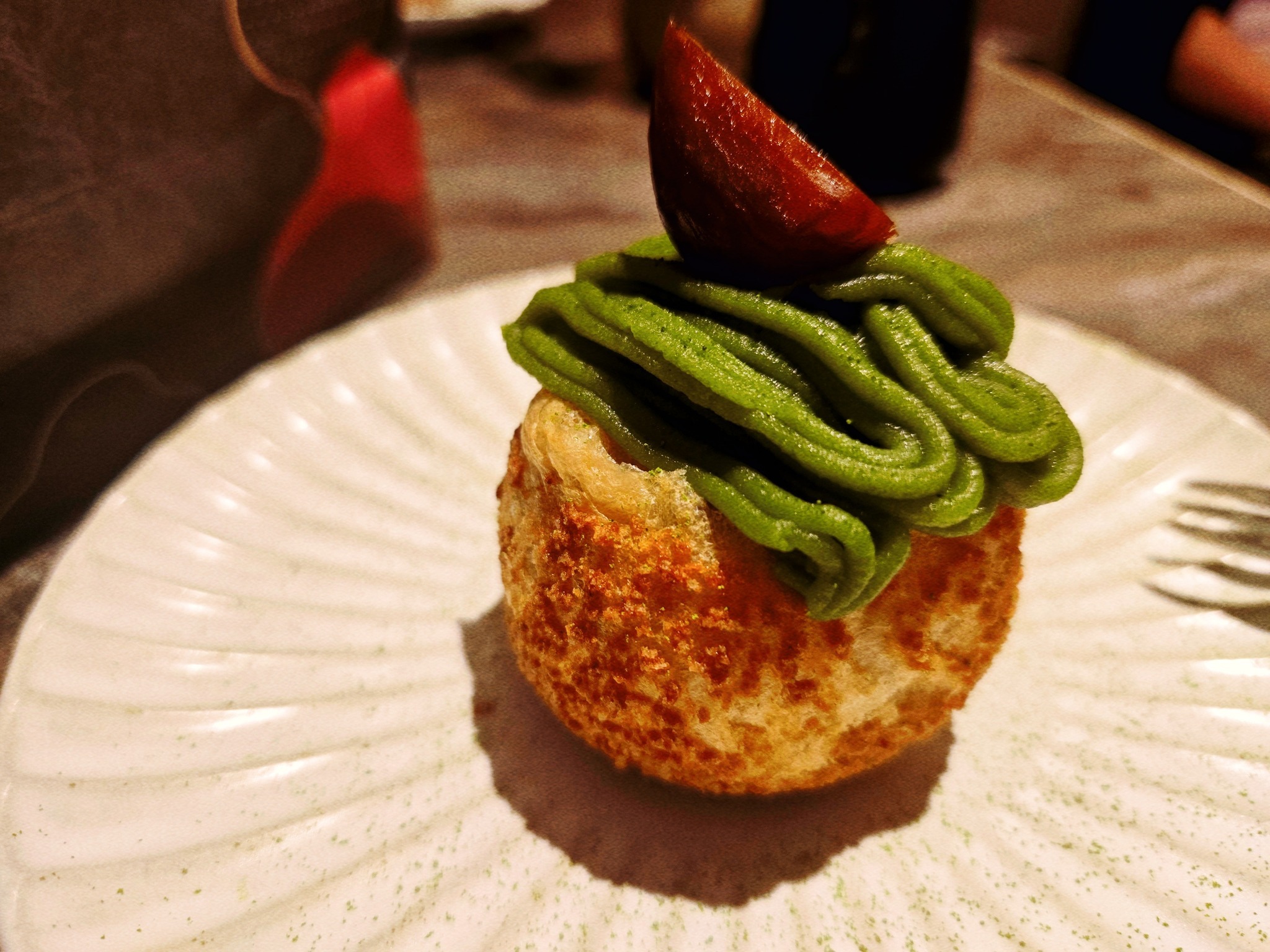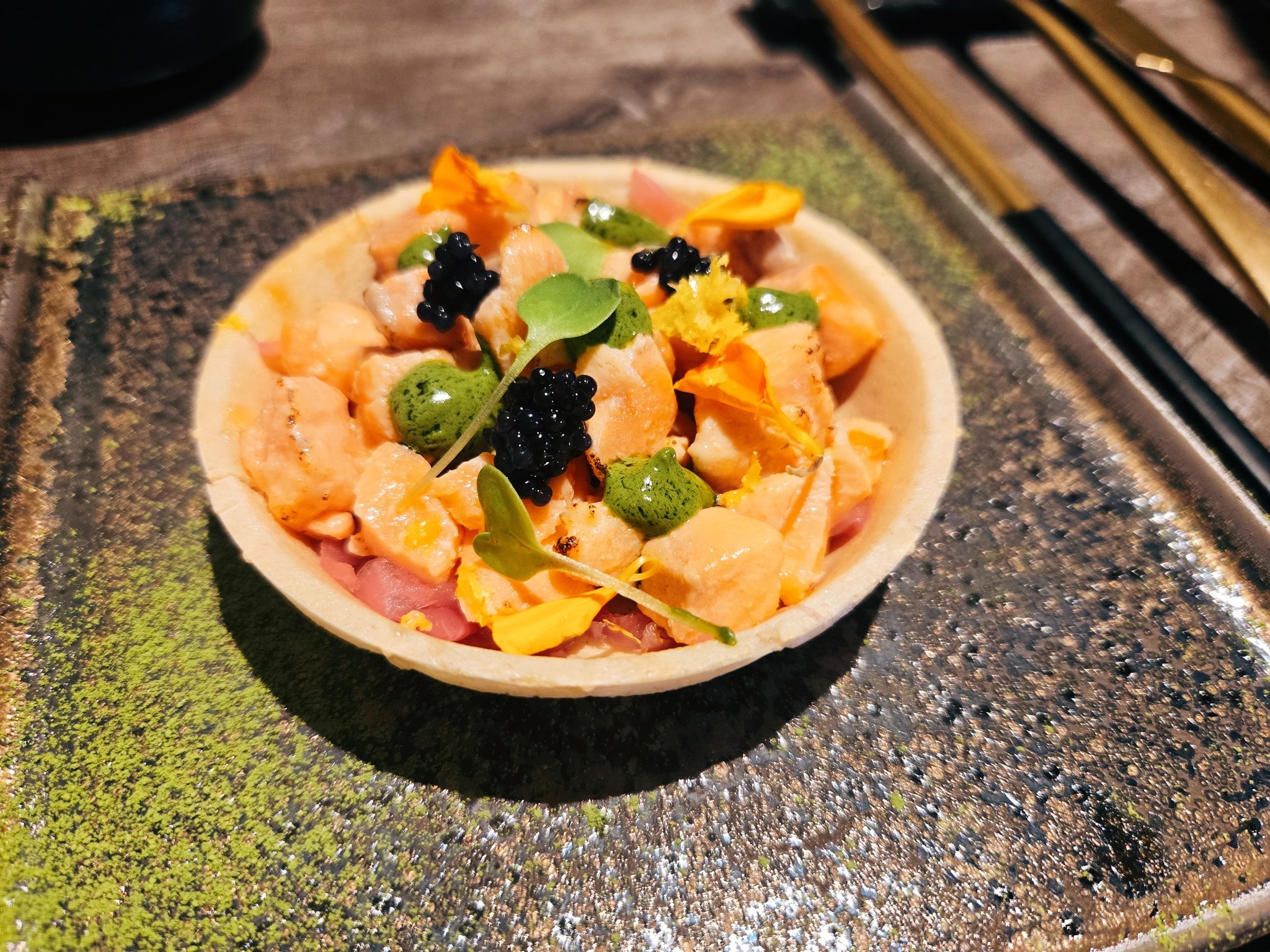 藝奇主打「青翠茶韻」入饌,以職人日式茶燻技法為引。主菜「一〇八抹茶海鮮盛合」嚴選鮮蝦、鮑魚、軟絲的三味珍饌,軟絲以蒸炸雙工法疊映鮮味,抹茶粉伴隨溫熱石盤,甫掀蓋就能感受海鮮與茶韻交織。