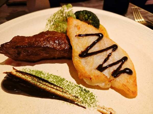 陶板屋的主菜「海陸佐一〇八雙茶」以牛排與魚排搭配由焙茶與黑蒜融合的主廚特製佐醬,再以高品質京都宇治抹茶鹽增添牛肉層次,主打和風洋食與海陸食材碰撞出的四重風味。