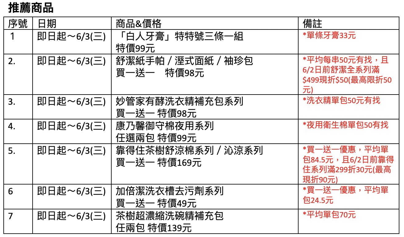 從即日起至6月3日,生活用品大優惠同步登場。知名品牌「白人牙膏」三條裝僅99元,平均單條33元。舒潔紙手帕與濕紙巾推出買一送一,平均每串49元,並於6月2日前購滿499元再折50元。