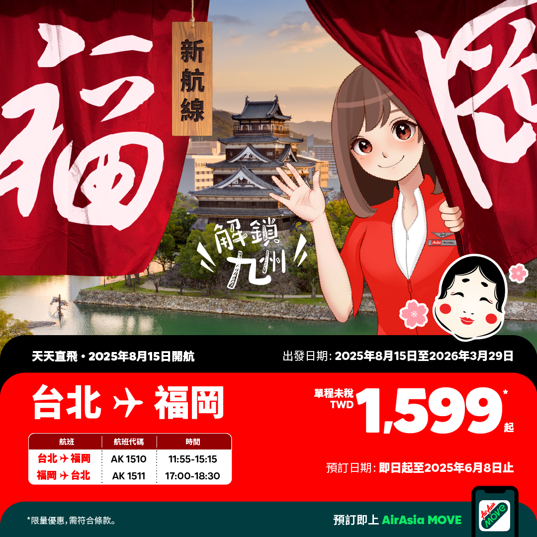 亞洲低成本航空品牌AirAsia今(2日)宣布,旗下馬亞航(航班代碼AK)將於2025年8月15日開通全新航線「台北-福岡」,這是AirAsia首度飛航日本九州,並成為其在台灣市場的第13條直飛航線、第五條日本航線。為慶祝新航線開賣,推出單程未稅優惠價新台幣1,599元起,開放預訂至6月8日,適用搭乘期間至2026年3月29日。