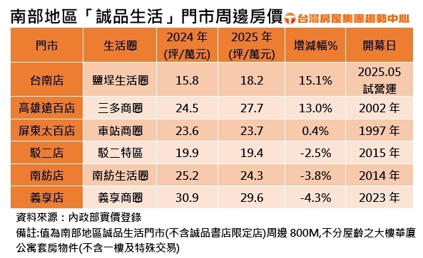 ▲南部地區誠品生活門市周邊房價。(圖/台灣房屋提供)