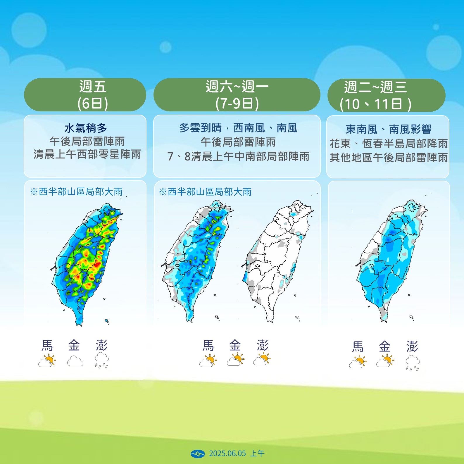 此外,滯留鋒面雖南移至巴士海峽,鋒面結構轉趨鬆散,但台灣附近水氣仍多,大氣不穩,新竹以南及花東山區有局部短暫雷陣雨,並有短時強降雨或局部大雨的機率,其餘地區亦不排除零星陣雨,建議攜帶雨具備用。離島方面,澎湖、金門、馬祖皆為短暫陣雨天氣,氣溫介於22至28度之間,整體偏涼。總體而言,未來幾天台灣的天氣將持續不穩定,民眾應該保持警覺,隨時關注最新的氣象資訊。