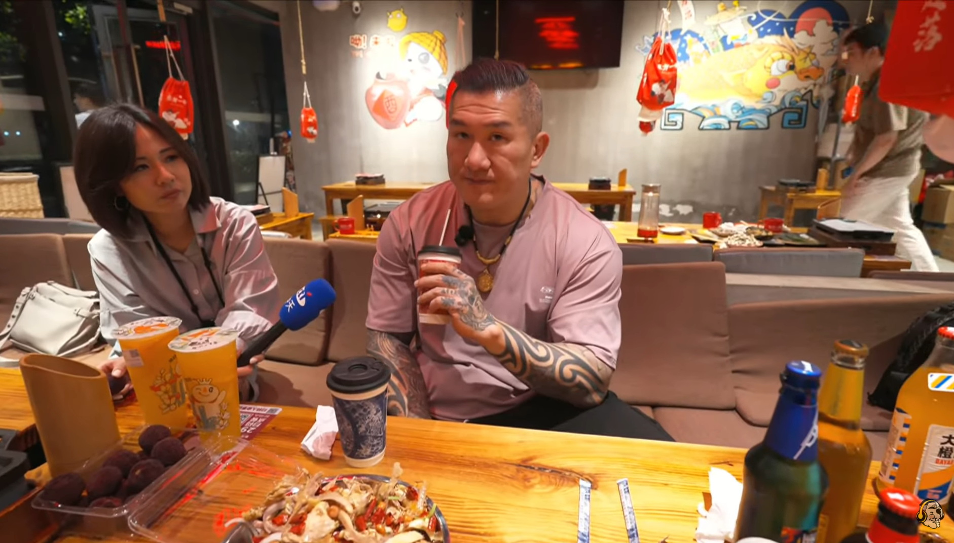 ▲館長到串燒店用餐,喝上中國粉絲送來的手搖飲。(圖/翻攝自館長YT)