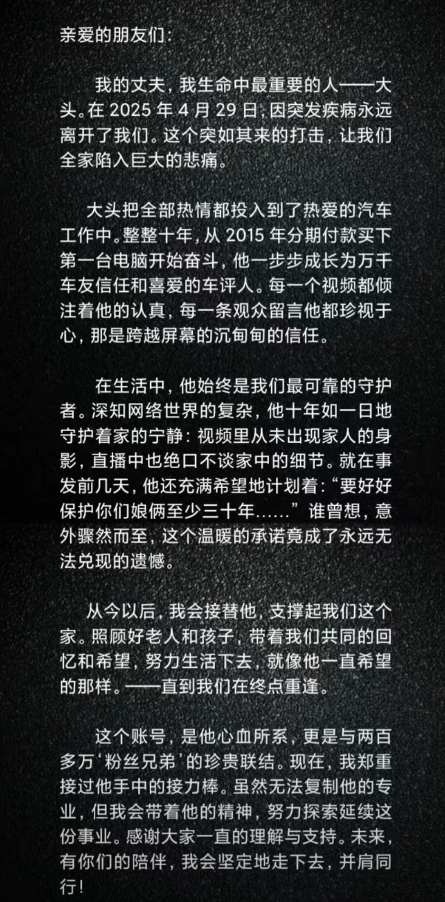 大頭的妻子表示,將接手經營「大頭評車」帳號,延續丈夫的精神與事業,並努力探索如何在這份事業中繼續前行。至於詳細死因,家屬選擇低調處理,拒絕對外透露。消息傳出後,粉絲紛紛在社群平台上留言悼念:「大頭一路好走」、「太突然了,真的難以接受」。大頭的離世不僅是家人的巨大損失,也讓整個汽車自媒體圈感到惋惜。