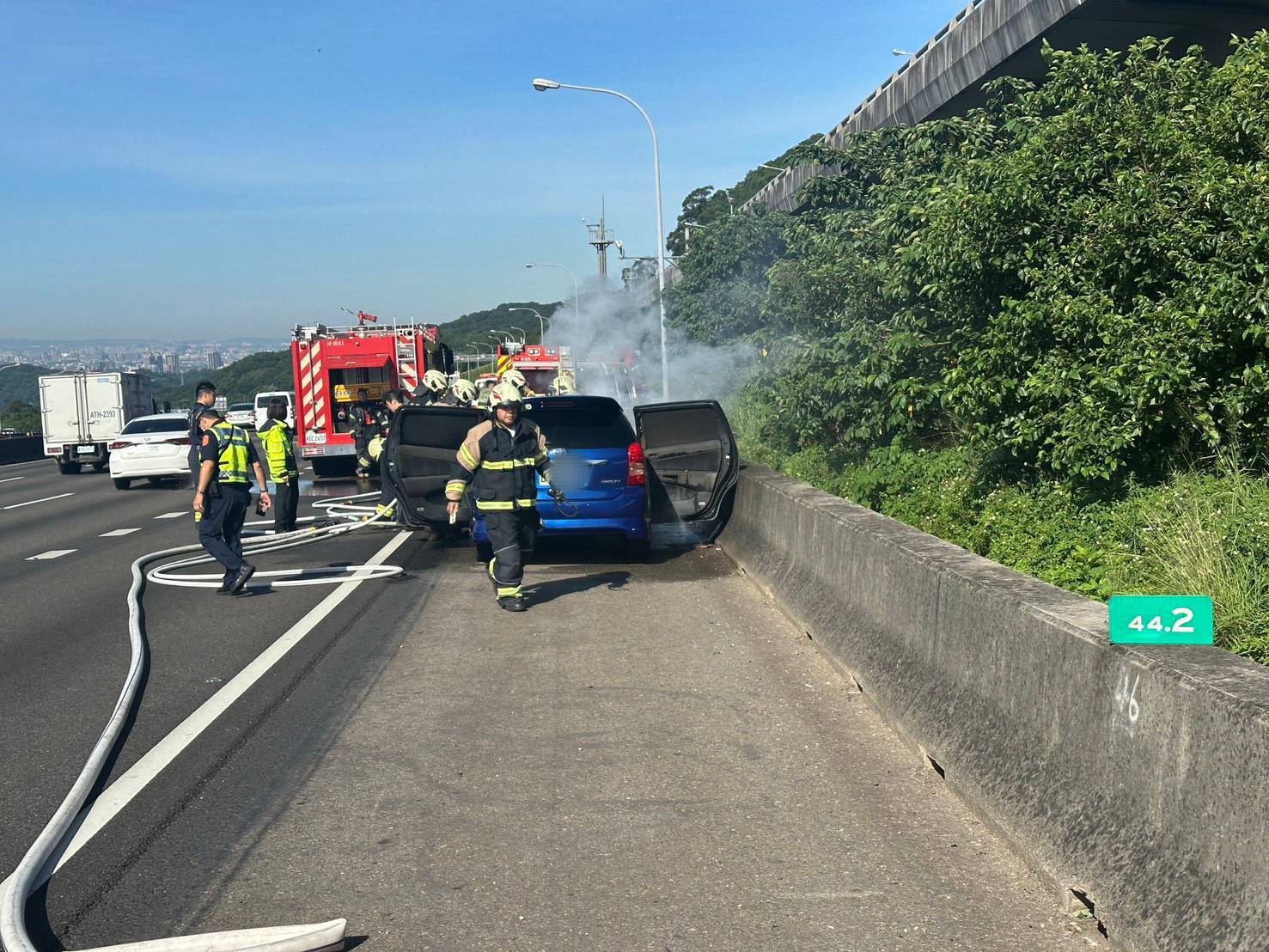 國道公路警察局第一公路警察大隊表示,勤務指揮中心於上午7時32分接獲通報,指國道1號南向44.3公里處有一部自小客車起火燃燒,立即通報線上巡邏車及消防單位趕往現場,並封閉外側路肩以利處理。