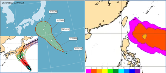 ▲左圖:23日2時氣象署「路徑潛勢預測圖」顯示,輕颱「聖帕」即將形成;右圖:1日20時歐洲系集模式機率模擬圖顯示,台灣東南方海面「輕颱」機率提高至30%,但未來9天內台灣尚無被侵擾的機率。(圖/翻攝「氣象應用推廣基金會」專欄)