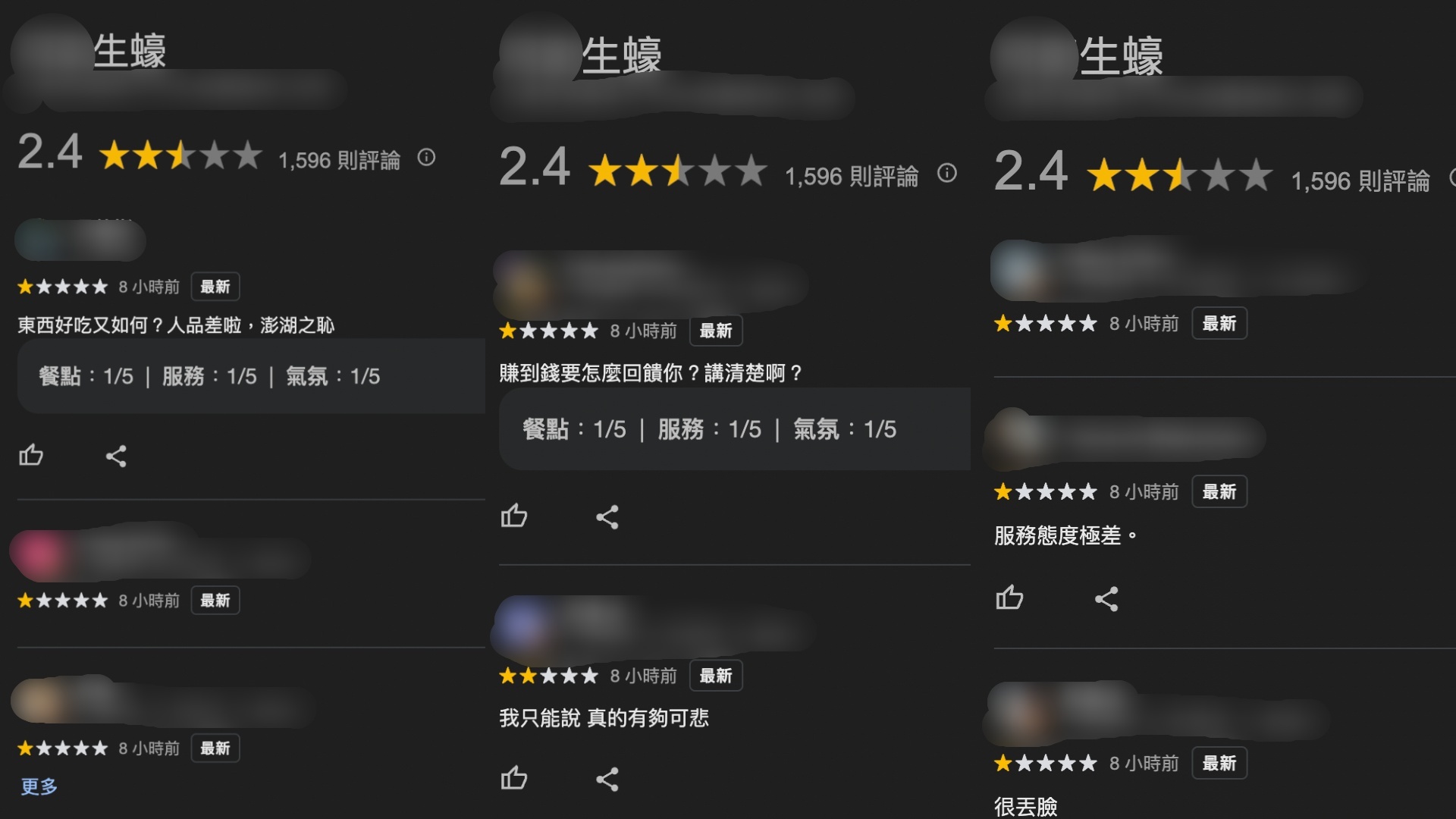 ▲網友氣到刷一星,店家Google評論慘剩2.4顆星。(圖/翻攝自google maps)