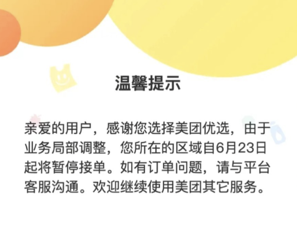 美團優選以「社區團購」模式運營,提供蔬菜、水果、生鮮及雜貨等商品的配送服務,曾在疫情期間廣受歡迎。然而,23日上午,美團優選的APP上突然出現「業務調整公告」,表示由於業務調整,部分地區將暫停接單。此舉引發廣泛關注,「美團優選關閉」迅速成為微博熱搜話題。
