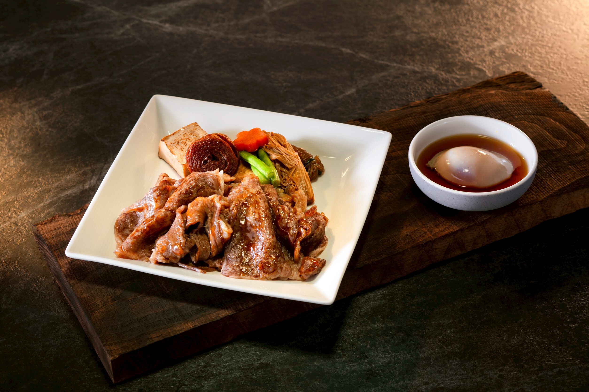 長榮航空與米其林一星「老乾杯」合作的機上餐點一直備受旅客好評。此次,特別為桃園出發至洛杉磯、舊金山及西雅圖的皇璽桂冠艙旅客獻上奢華料理「老乾杯日本A5和牛壽喜燒」。這道料理選用日本頂級A5和牛肋眼,搭配特製壽喜燒醬與溫泉蛋,完美展現極致日式風味。