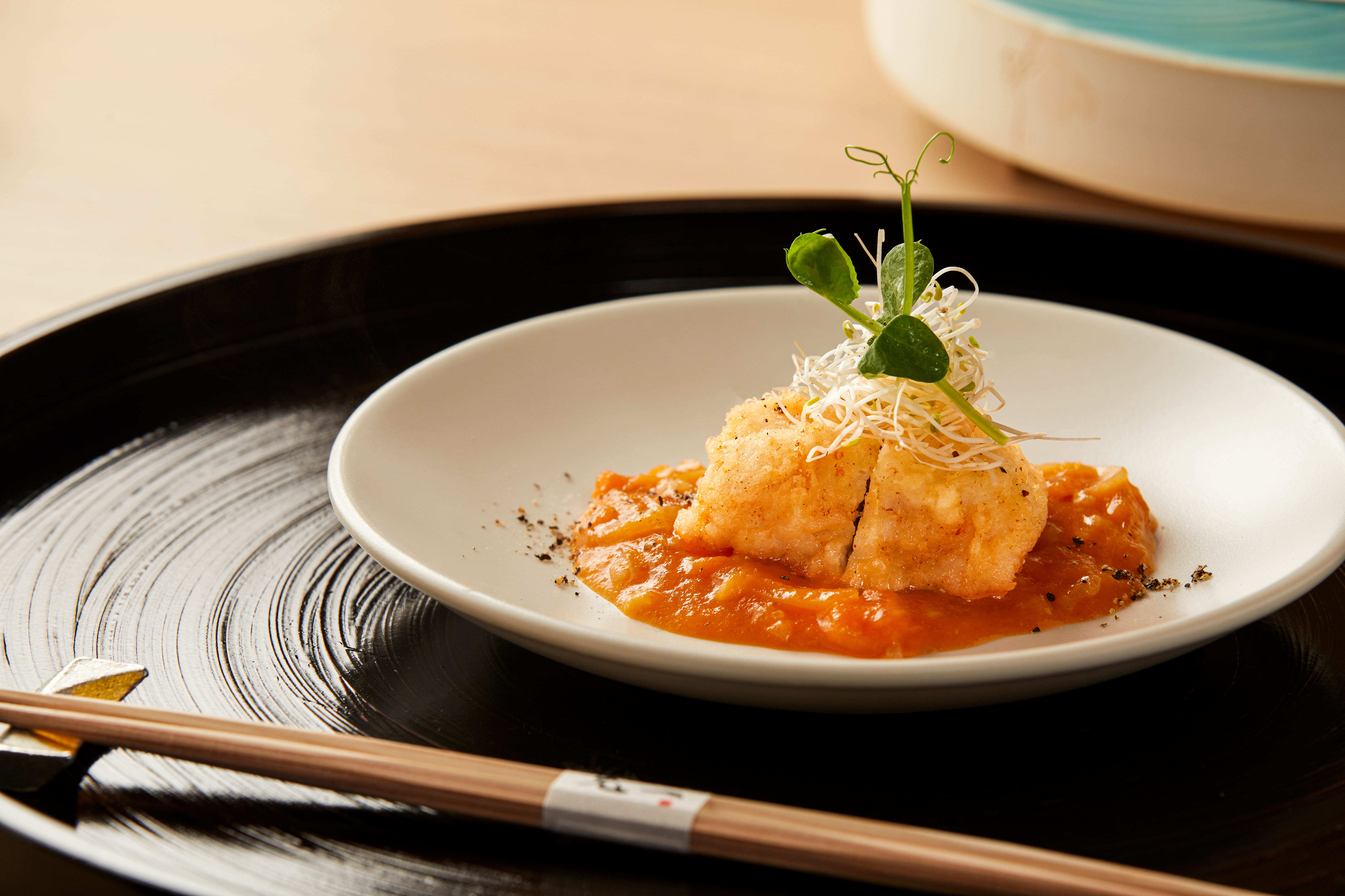 餐廳僅設16席板前座位,全程無背景音樂,主廚備料、裹粉、下鍋、出餐皆在顧客面前完成。油聲為節奏、火花為演出,透過節氣變化與當令食材,呈現一場專屬於現場的五感用餐儀式。
