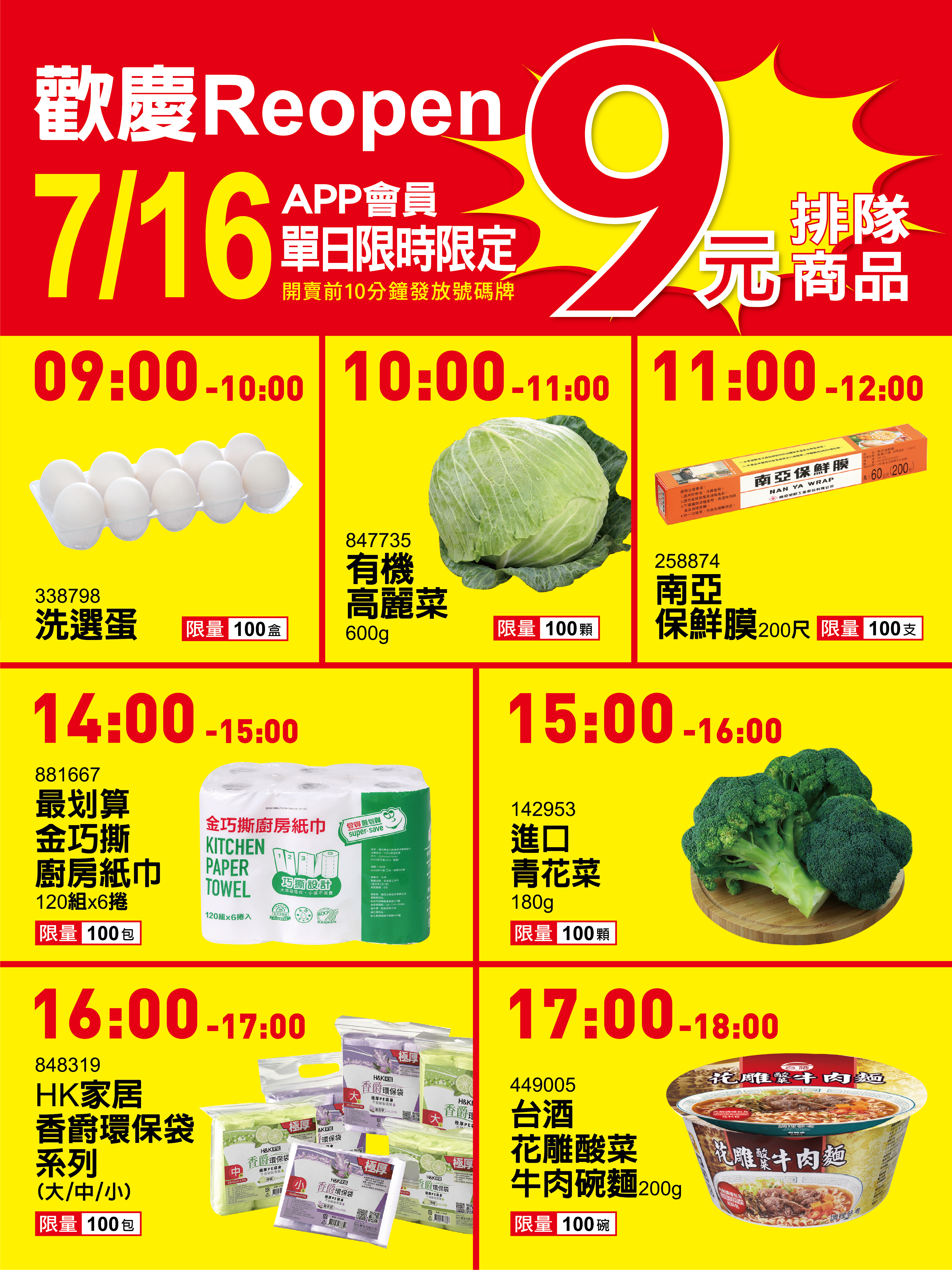 開幕首日(7/16),祭出7項生活必備品通通限時只要9元,包括: