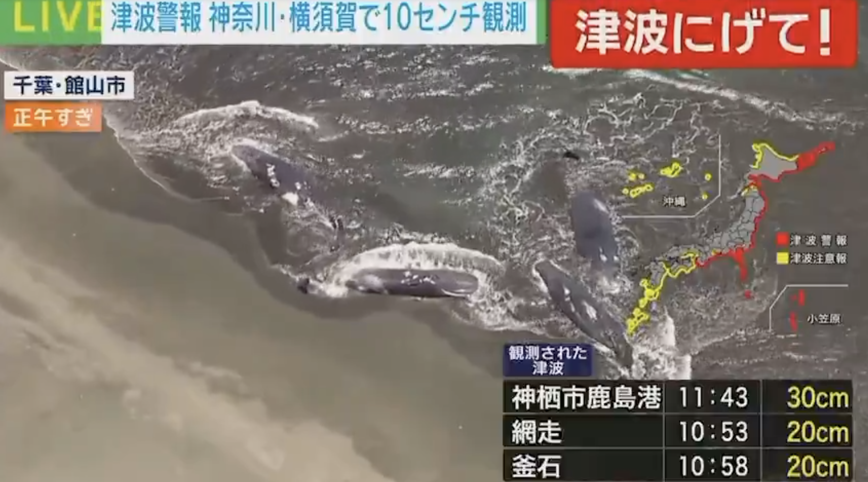 地震發生數小時後,千葉縣館山市驚見至少4頭抹香鯨擱淺岸邊,形成罕見景象。當地民眾緊急通報相關單位協助救援,初步不排除與地震或海嘯帶來的洋流異變有關,但確切原因仍待海洋專家進一步調查。