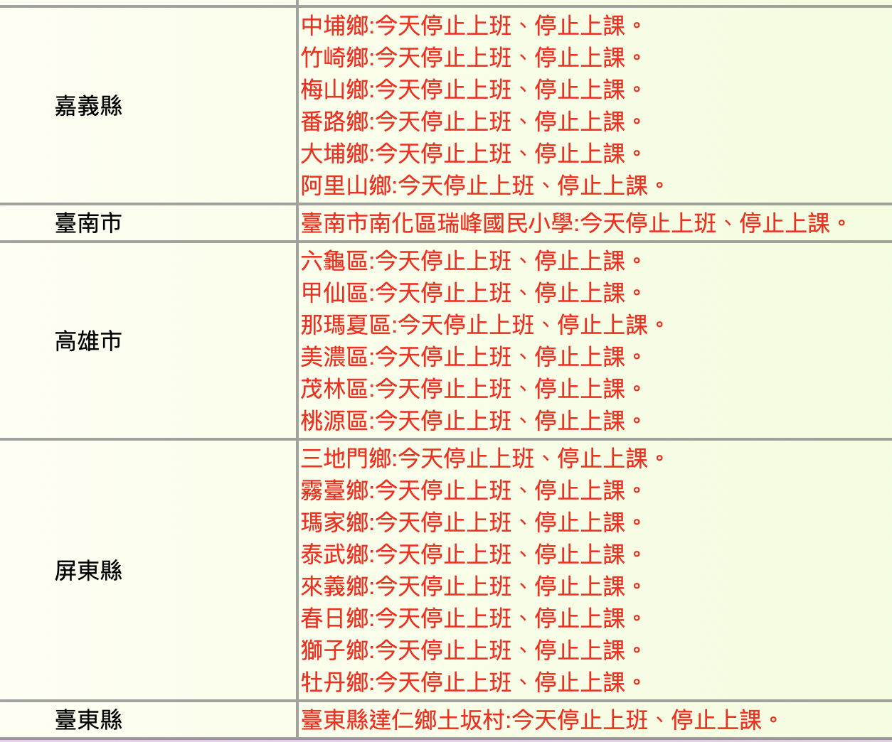 高雄市那瑪夏、甲仙、美濃、桃源、六龜與茂林等6行政區,今日也因土石流及大規模崩塌警戒發布,宣布全面停班停課。屏東縣則有霧台、三地門、瑪家、來義、泰武、春日、獅子、牡丹等8個山區原鄉鄉公所宣布停班停課,其餘地區照常辦公上課。
