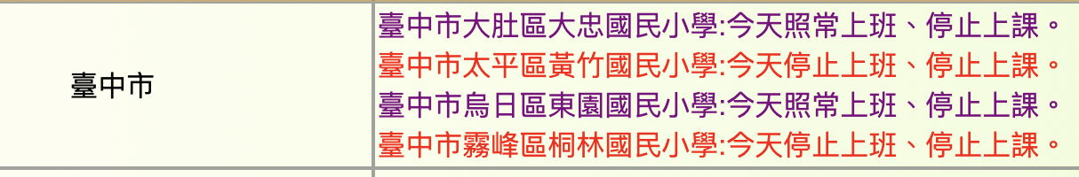 台中市原未宣布全面停課,但市府於上午10時突公布,太平區黃竹國小、霧峰區桐林國小7月31日停止上班上課;烏日區東園國小、大肚區大忠國小則為正常上班、停止上課。不少家長得知消息時已出門上班,湧入市府臉書粉專怒批「來不及接孩子」、「資訊太臨時」。