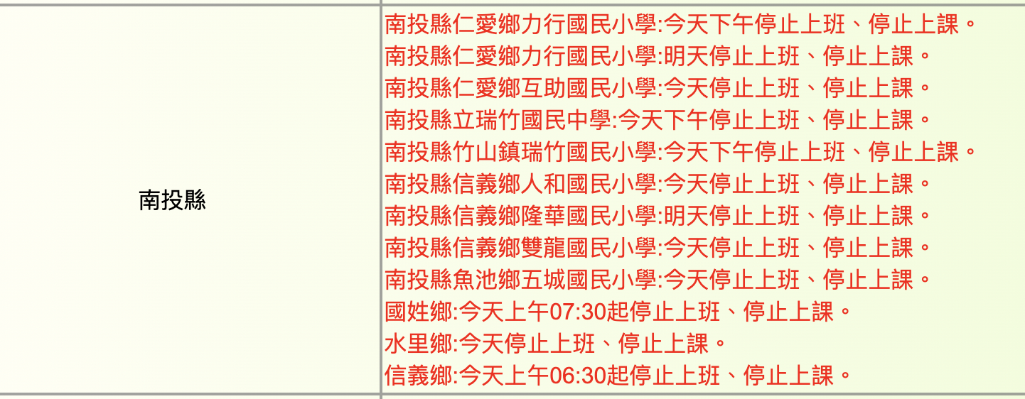 ▲南投縣停班停課資訊。(圖/翻攝自行政院人事行政總處)