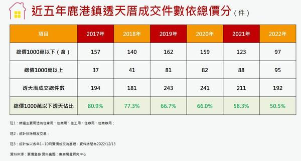 鹿港位於彰化濱海地區,因位置相對偏遠,過去房市交易量能不算突出,不過最近幾年在全台房價飆漲的背景下,鹿港房市也有相當驚人的表現。東森房屋研究中心彙整實價登錄資料發現,以鹿港交易最火熱的透天厝來說,目前鹿港透天平均成交總價高達1296萬元,相較於2017年同期的794萬元,短短五年就激增六成。另外,進一步觀察鹿港透天總價分布可以發現,2017年鹿港總價低於1000萬的透天厝還有八成以上,但到了今年,這一數據已經低至50.5%,顯見鹿港房價漲勢之猛烈。